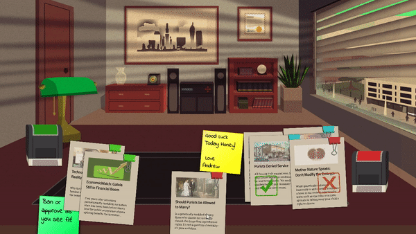 A stack of news article sits on your desk, two stampers on each side – green to approve, red to reject. Your reporting team is hacking away in the background as corporate music plays through the loudspeaker. It’s time to make decisions…